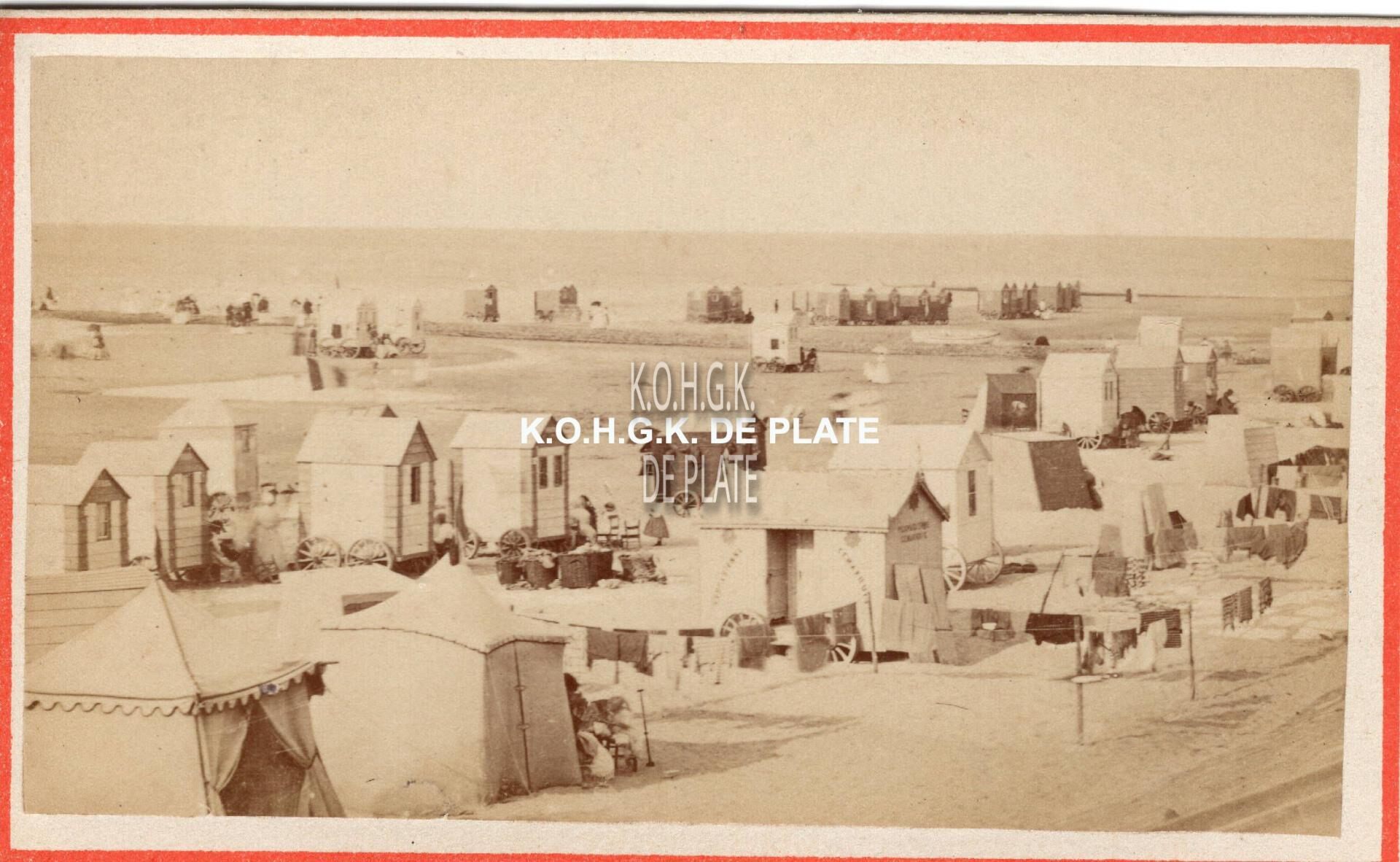 Formaat : 6 x 9,5 cm. - . Vooraan strandtenten, op de achtergrond badkarren