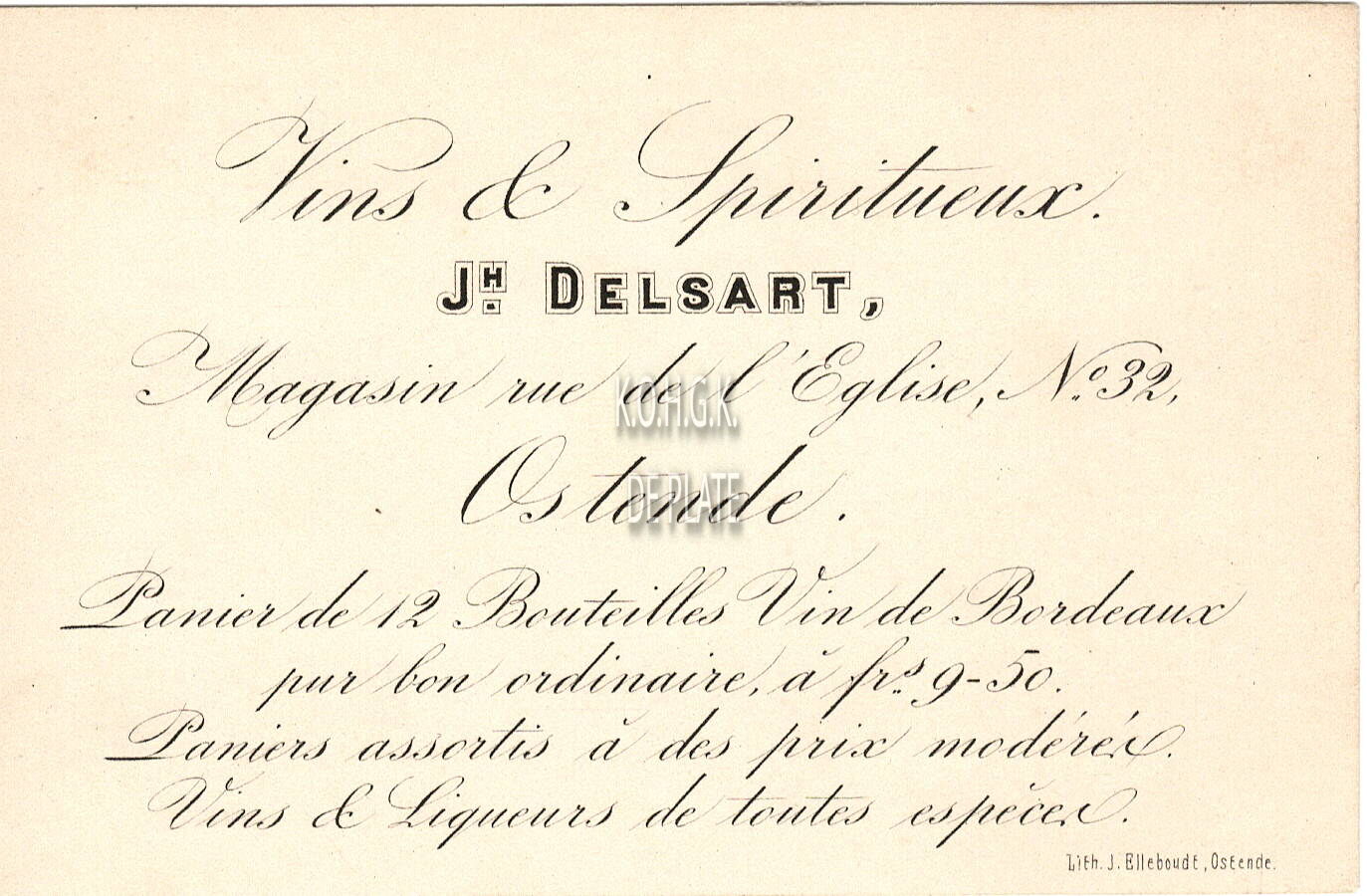 Formaat : 7,5 x 11,6 mm. - Vins & Spiritueux Jh.Delsart. Magasin rue de l'Eglise N° 32. Panier de 12 Bouteilles Vin de Bordeaux pur bon ordinaire à Frs 9-50. Panier assortis à des prix modérés Vin & Liqueurs de toutes espèces.