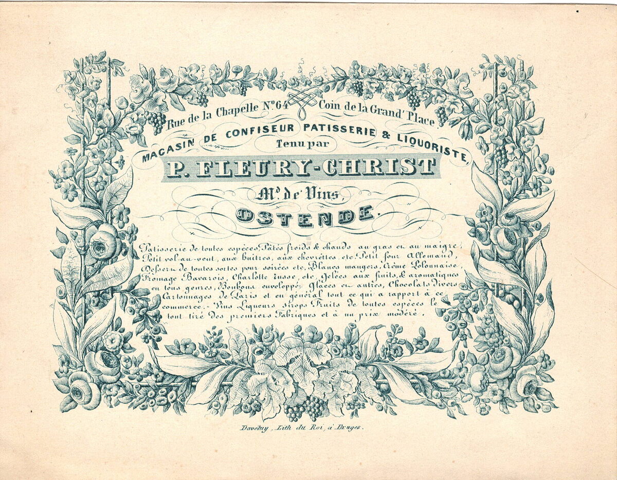Formaat : 11,9 x 15,5 mm. - Magasin de Confiseur, Patisserie & liquoriste tenu par P.Fleury-Christ .,Ms de Vins Rue de la Chapelle, N° 64 coin de le Grand'Place. Patisserie de toutes espèces. Patés froids et chauds au gras et au maigre. Petit vol-au vent aux huitres aux chevrèttes etc. Petit four Allemand Dessers de toutes sortes pour soirées etc. Blancs mangers, Créme Polonnaise, Fromage Bavarois Charlotte russe etc.