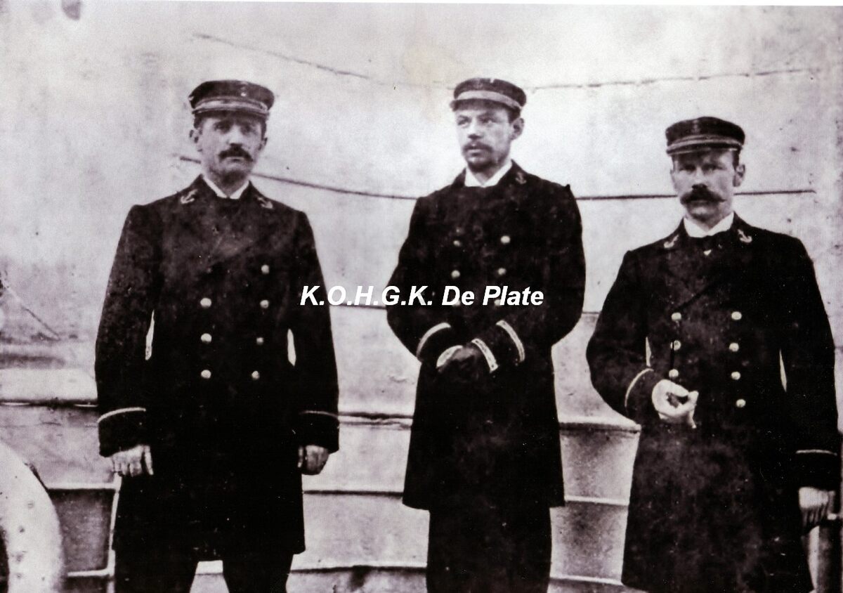 Afdruk, formaat : 29.5 x 21 cm. - Officieren van de pakketboot "La Flandre". Van links naar rechts : Cattoor G. (luitenant), Bouckaert (commandant) en Grayet (luitenant)