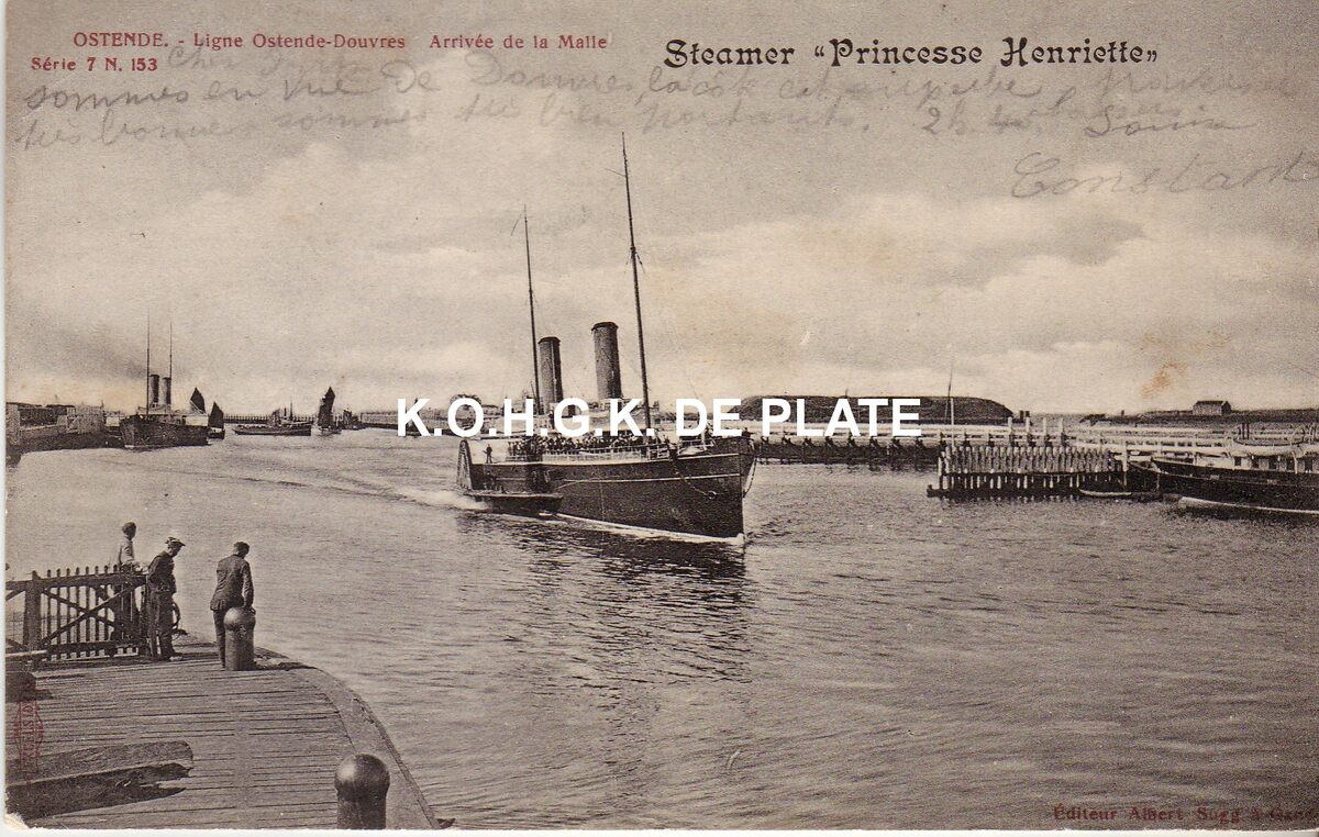 Sugg., série 7, nr. 153. - Ligne Ostende-Douvres. Arrivée de la malle. Steamer "Princesse Henriette" - De pakketboot "Princesse Henriette" in de havengeul nabij haar aanlegplaats (links). Rechts, de staketsel nabij de oosteroever