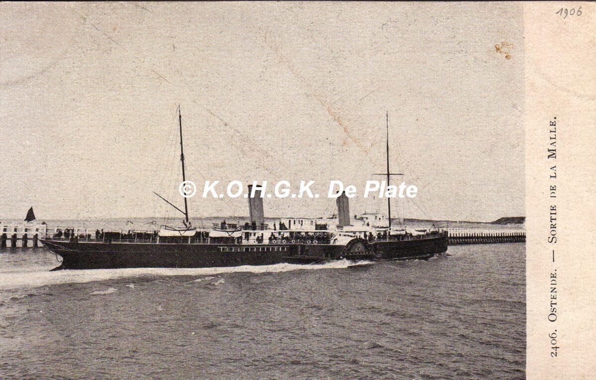 Postkaart 2406. Ostende - Sortie de la malle (sic). De "Marie-Henriette" werd gebouwd bij John Cockerill en kwam in dienst in 1893. Het schip haalde 22,2 knopen en was het snelste passagiersschip ter wereld op dat ogenblik. Zo behaalde de lijn haar eerste internationaal rekord. Op 24 oktober 1914 liep de "Marie-Henriette op de rotsen te Harfleur en zonk. Alle opvarenden met inbegrip van 650 gekwetste soldaten werden gered.
