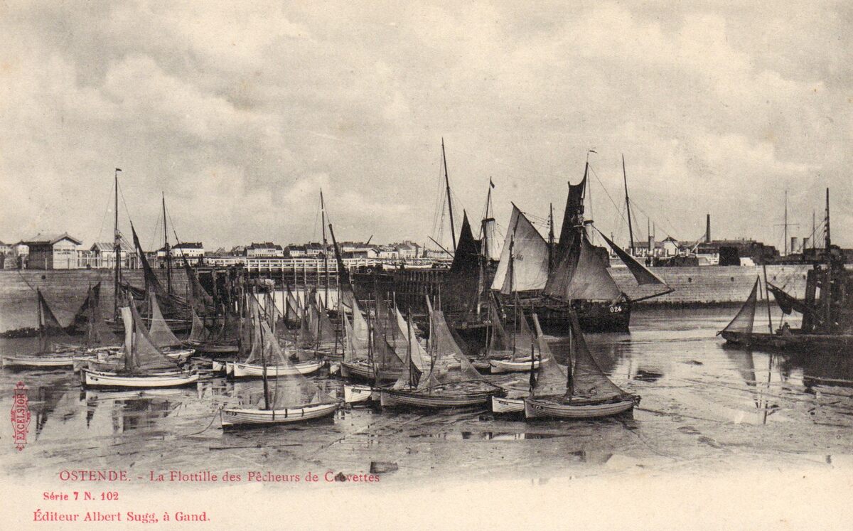 Postkaart : Excelsior. Editeur Albert Sugg, Gand, serie 7, nr. 102. Ostende. La Flotille des Pêcheurs de Crevettes. Open garnaalboten of Oostendse schovers in het Schuildok. Achteraan de O.24 "Martha", reder Maurice Desforges. Op de achtergrond de oosteroever met bewoning op de Vuurtorenwijk. Bron : O.24 : Rapport sur l'administration et la situation des affaires de la Ville d'Ostende. 1898, p.157-158.