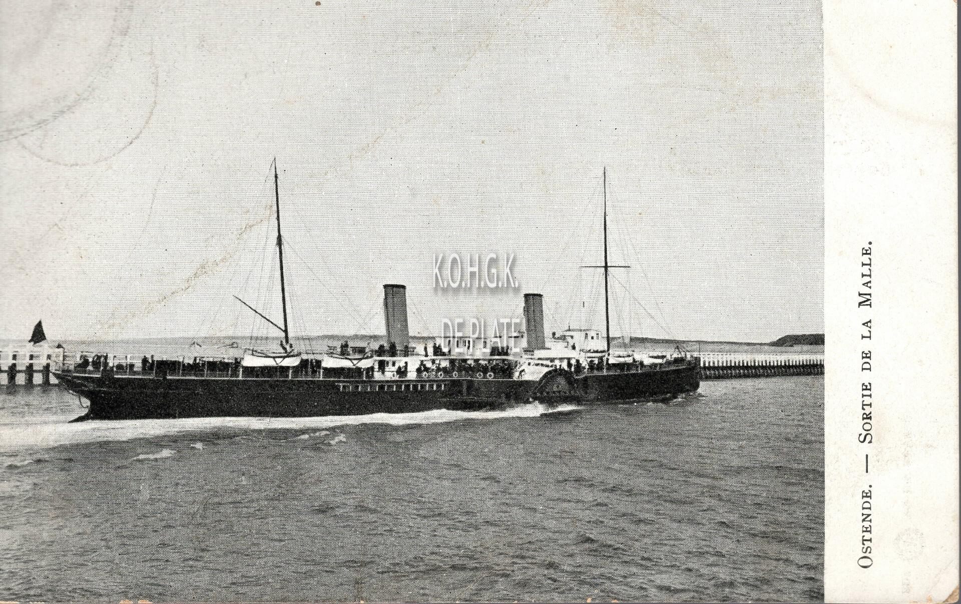 VO-DW. - Ostende - Sortie de la Malle (sic). - De pakketboot "Princesse Clémentine" vaart de haven van Oostende binnen. Op de achtergrond, het Ooststaketsel en oosteroever. Gebouwd op de scheepswerf Cockerill te Hoboken. Liep van stapel in 1896 en kwam in juni 1897 in dienst. Het was het laatste raderschip dat gebouwd werd ten behoeve van de Oostende - Dover lijn. Het was de eerste kanaalveerboot waarop een radioinstallatie geplaatst werd. Ten behoeve van de radioverbindingen met het schip werd in De Panne een zend- en ontvangstpost gebouwd.