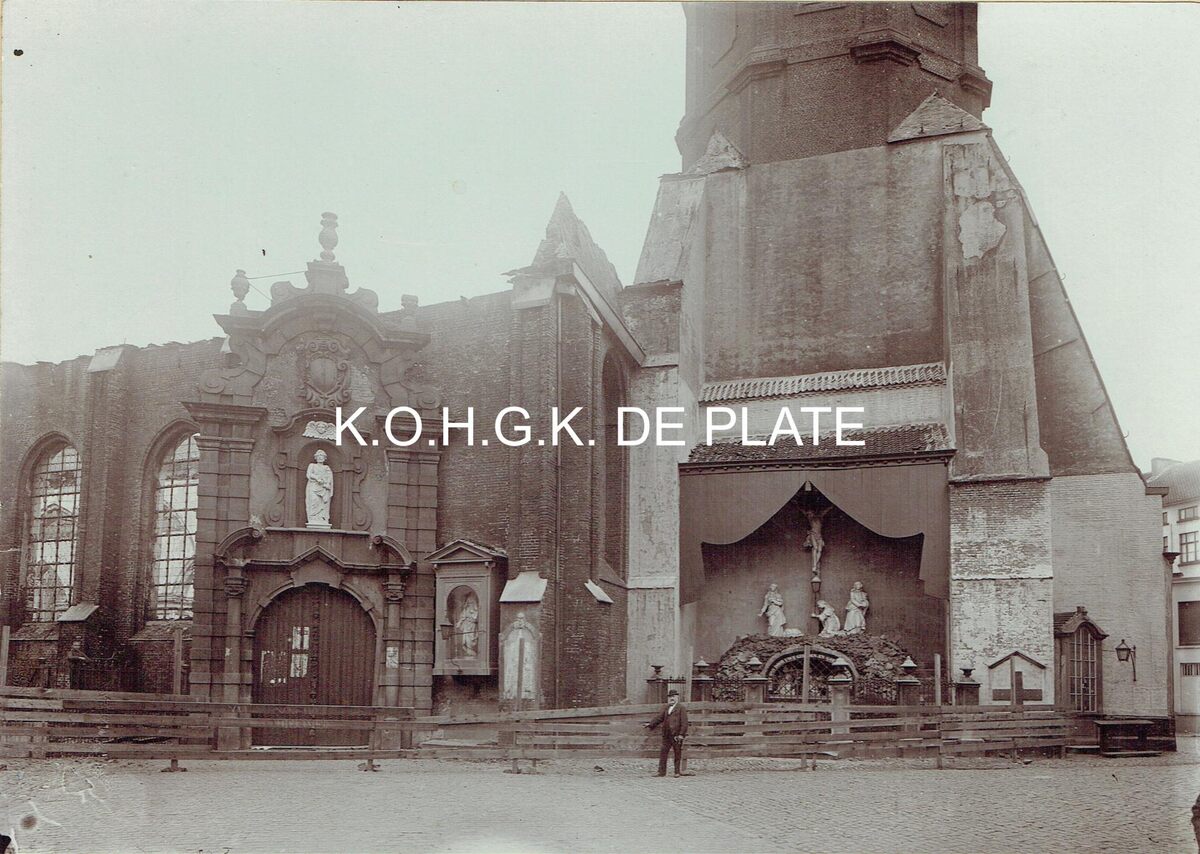 Foto op karton. - Formaat : 17 x 23cm. - Notaris Van Caillie poserend voor de toren (De Peperbusse) van de afgebrande kerk.