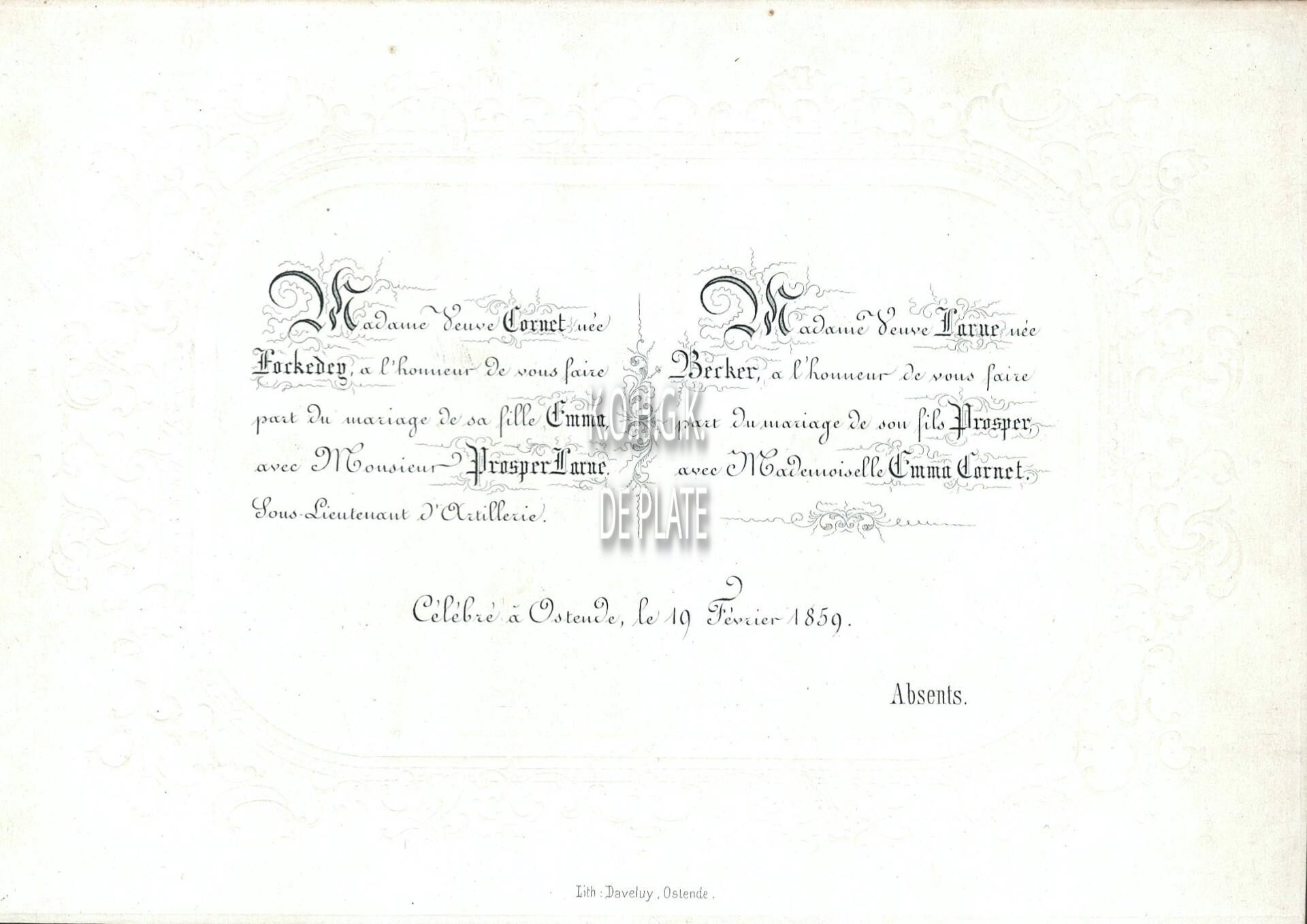 Formaat : 15,6 x 19,5 cm. - Madame Veuve Cornet née Fockedey à l'honneur de vous faire part du mariage de sa fille Emma avec Monsieur Prosper Larue, Sous-Lieutenant d'Artillerie - Madame Veuve Larue née Becker à l'honneur de vous faire part du mariage de son fils Prosper Larue avec Mademoiselle Emma Cornet. Célébré à Ostende le 19 Février 1859.