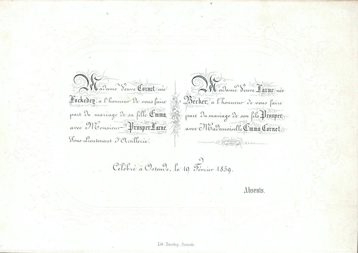 Formaat : 15,6 x 19,5 cm. - Madame Veuve Cornet née Fockedey à l'honneur de vous faire part du mariage de sa fille Emma avec Monsieur Prosper Larue, Sous-Lieutenant d'Artillerie - Madame Veuve Larue née Becker à l'honneur de vous faire part du mariage de son fils Prosper Larue avec Mademoiselle Emma Cornet. Célébré à Ostende le 19 Février 1859.