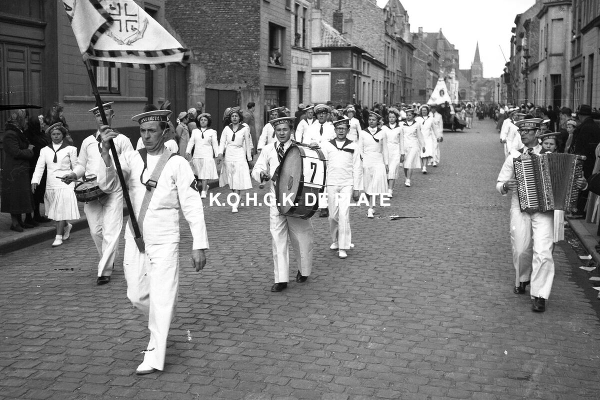 Negatief : 4 x 6,5 cm. - De folkloregroep de "Matroosjes" uit Bredene met leden van de spaarmaatschappij "Concordia"