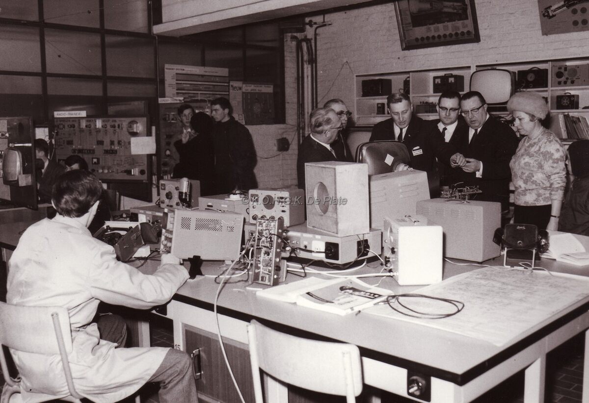 De heer en mevrouw John Lauwereins, schepen van openbaar onderwijs, krijgen uitleg over de apparatuur in de Stedelijke Visserijschool "John Bauwens", tijdens de inhuldiging. Naast de schepen, Jozef Decleyre, directeur van de Stedelijke Vakschool.