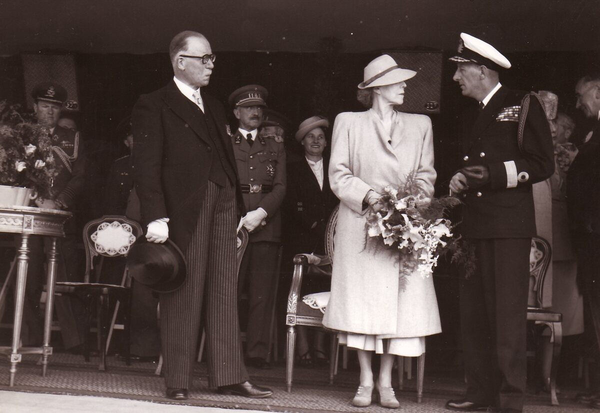 Formaat : 13 x 18 cm. - Tribune opgesteld op de puingronden van het Kursaal. Koningin Elisabeth in gesprek met commodore Georges Timmermans. Links, burgemeester Henri Serruys