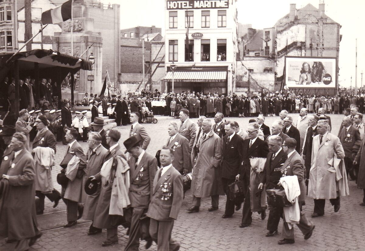Formaat : 13 x 18 cm. - Tribune opgesteld op het Sint Petrus en Paulusplein. Koningin Elisabeth liet zich vervangen wegens ongesteldheid door Prinses Jean de Mérode. De oudstrijders defileren voorbij het monument der gesneuvelden op het St-Petrus en Paulusplein. De leerlingen van het Koninklijk Werk Ibis zijn ook aanwezig. De sporen van de vernielingen uit de Tweede Wereldoorlog zijn nog goed te zien. Op de achtergrond Hotel Maritime, nr.20. Het hotel had 8 kamers met lopend water en centrale verwarming. Was gans het jaar open en had 1 badkamer. Op de hoek reclamebord voor Coca Cola