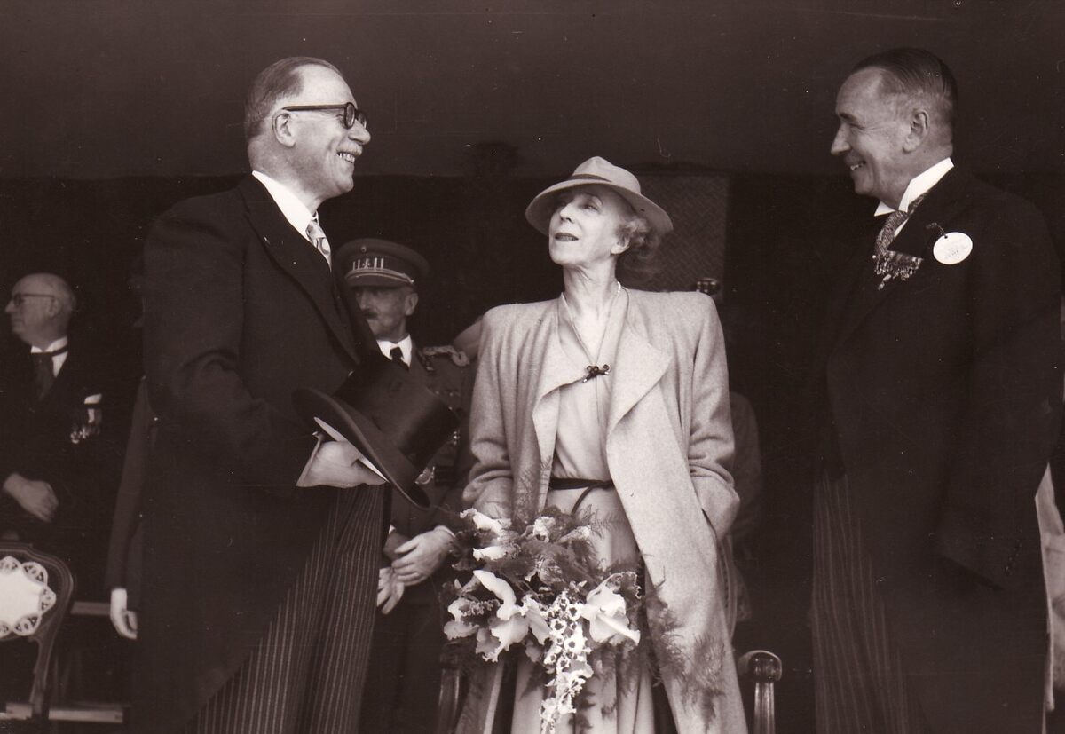 Formaat : 13 x 18 cm. - Tribune opgesteld op de puingronden van het Kursaal. Koningin Elisabeth in gesprek met burgemeester Hendrik Serruys (links)
