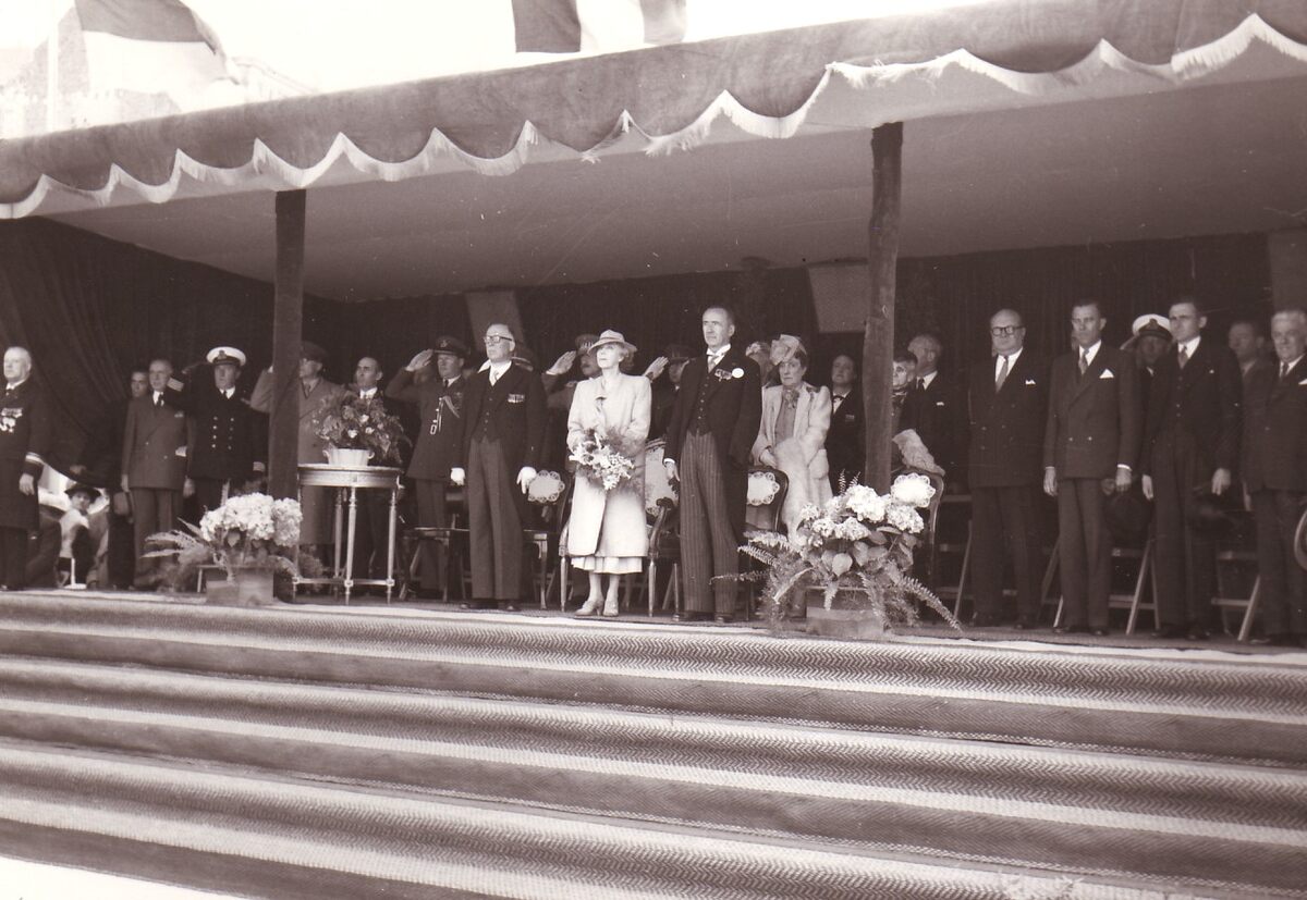Formaat : 13 x 18 cm. - Tribune opgesteld op de puingronden van het Kursaal. De eretribune met centraal koningin Elisabeth met links van haar burgemeester Hendrik Serruys. Tweede van rechts, de provinciegouverneur van West-Vlaanderen Pierre van Outryve d'Ydewalle, met naast hem de minister van landsverdediging Raoul De Fraiteur en eerste minister Paul-Henri Spaak. Achter de eerste paal rechts, half verborgen Prinses Jean de Mérode.
