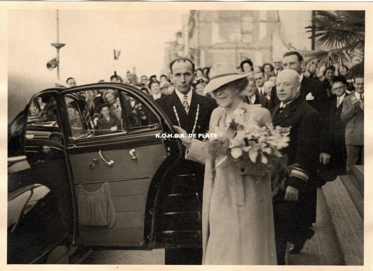 Formaat : 13 x 18 cm. - Na de plechtigheid verlaat Koningin Elisabeth de tribune, die opgesteld stond op de puingronden van het Kursaal langs de Albert I-promenade.. - Map 014 A-24a