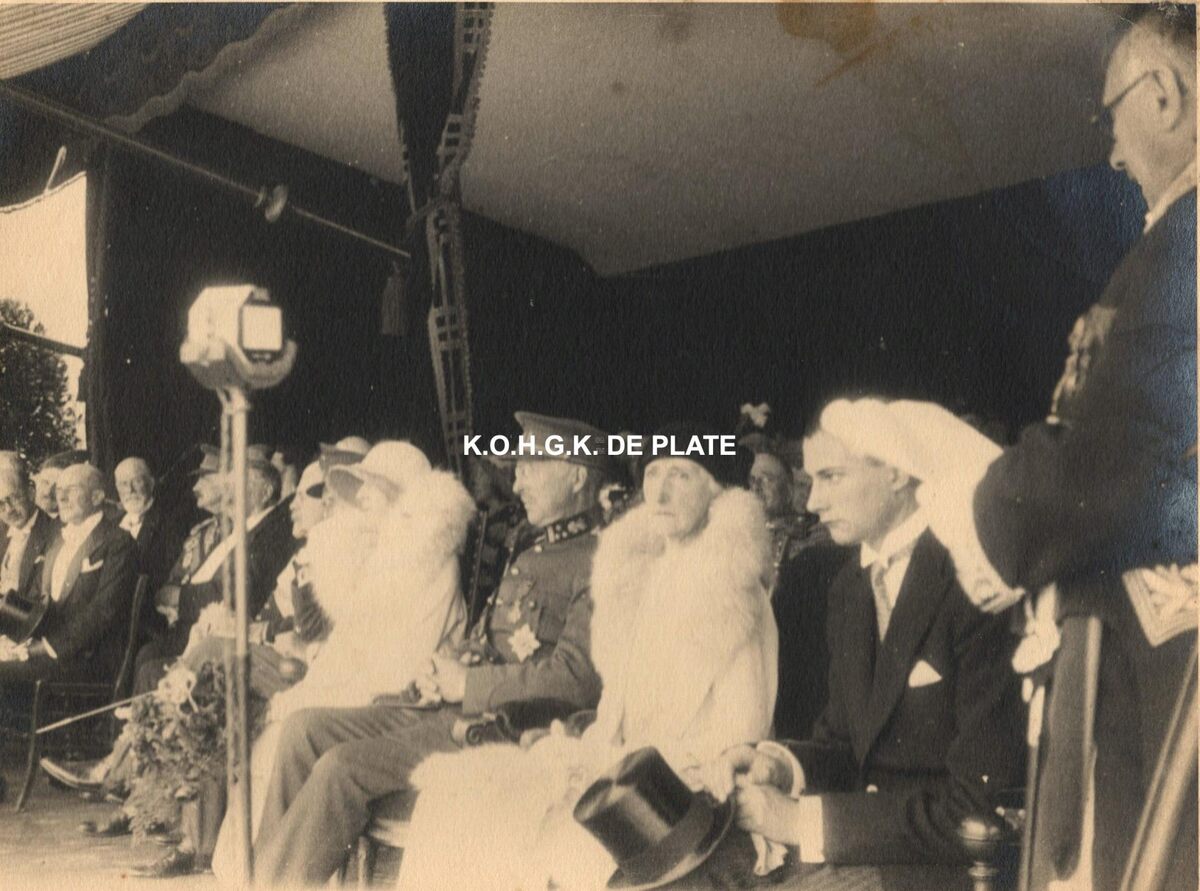 Formaat : 18 x 24 cm. - Burgemeester Edouard Moreaux houdt zijn toespraak naar aanleiding van de plechtige inhuldiging van het Leopold II monument. We herkennen van rechts naar links, burgemeester Edouard Moreau, Prins Napoléon de zoon van Prinses Clementine, Prinses Clementine, Koning Albert, Koningin Elisabeth...