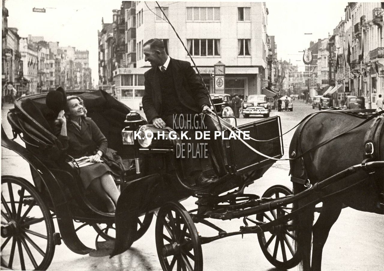 Formaat : 13 x 18 cm. - Voor de ingang van het Kursaal, Elfie Mayerhofer in het gezelschap van een Oostendse koetsier. Rechts, de Langestraat en links, de Van Iseghemlaan. In het midden, taxi's wachten op klanten nabij het openbaar uurwerk