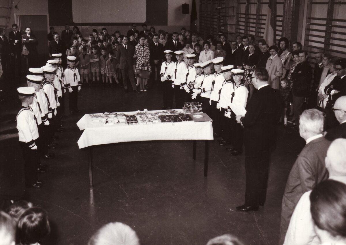 Formaat : 13 x 18 cm. - Directeur Hubert Caestecker houdt een toespraak tijdens het plechtig communiefeest