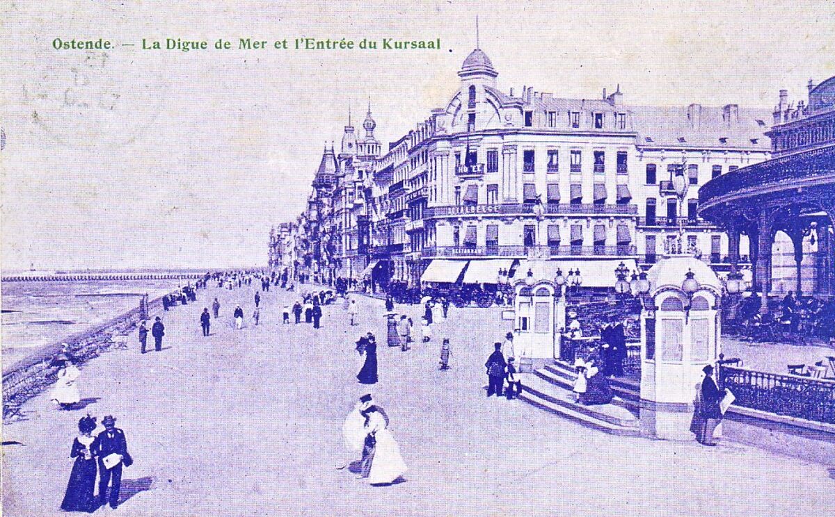 De zeedijk ten oosten van het Kursaal. Op de hoek met de Kursaal-Oosthelling, het Hôtel Royal Belge