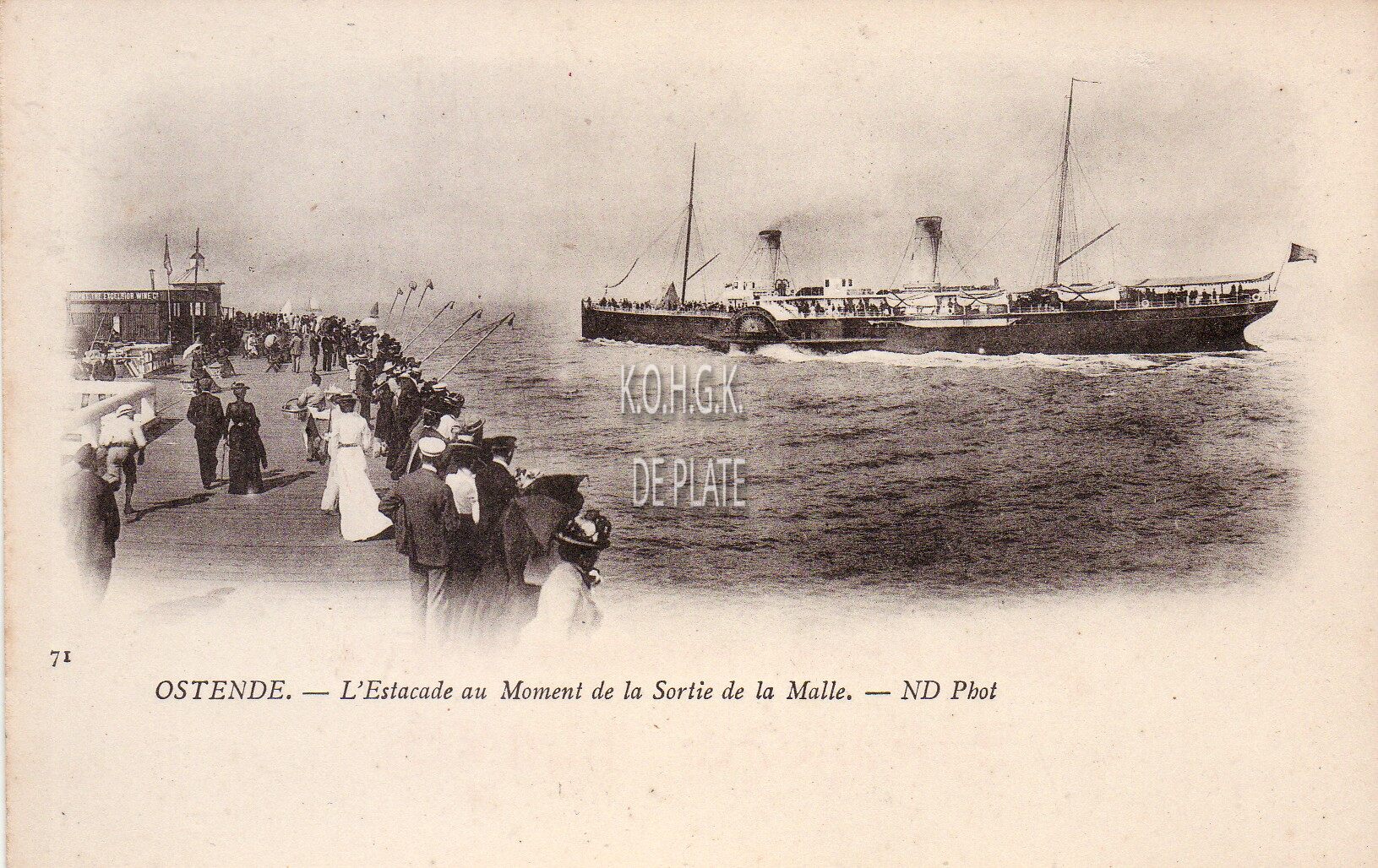 [Neurdein], ND Phot., N° 71. - Ostende - L'Estacade au Moment de la Sortie de la Malle. - We zien vanaf het Weststaketsel een pakketboot van de Oostende Dover lijn de haven verlaten. "'t Koptje van 't hoofd", of het einde van het staketsel met een paviljoentje, waar je een drankje kon nuttigen en genieten van de gezonde zeelucht. Met een kruisnet kon je proberen een krabbetje of visje te verschalken. Oostende in de Belle Epoque.
