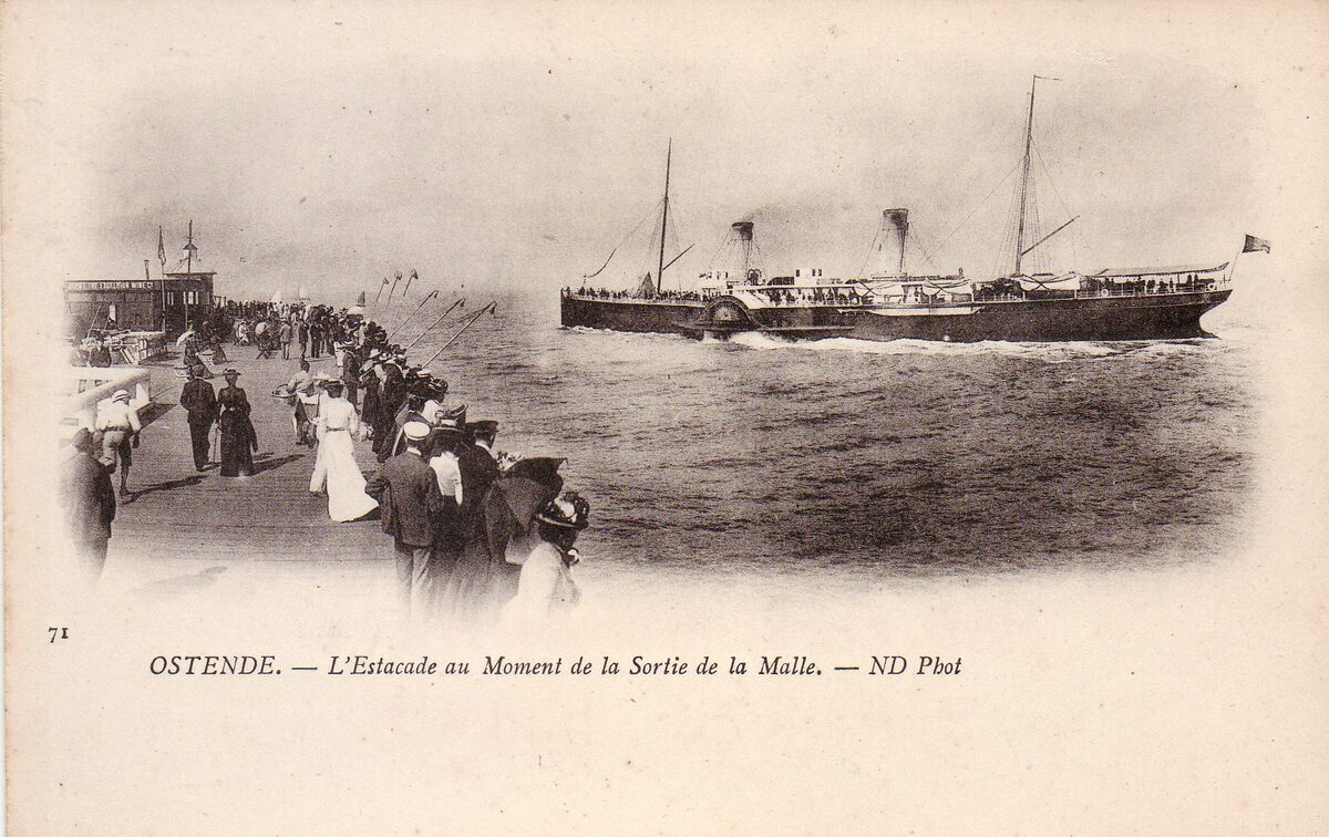 [Neurdein], ND Phot., N° 71. - Ostende - L'Estacade au Moment de la Sortie de la Malle. - We zien vanaf het Weststaketsel een pakketboot van de Oostende Dover lijn de haven verlaten. "'t Koptje van 't hoofd", of het einde van het staketsel met een paviljoentje, waar je een drankje kon nuttigen en genieten van de gezonde zeelucht. Met een kruisnet kon je proberen een krabbetje of visje te verschalken. Oostende in de Belle Epoque.