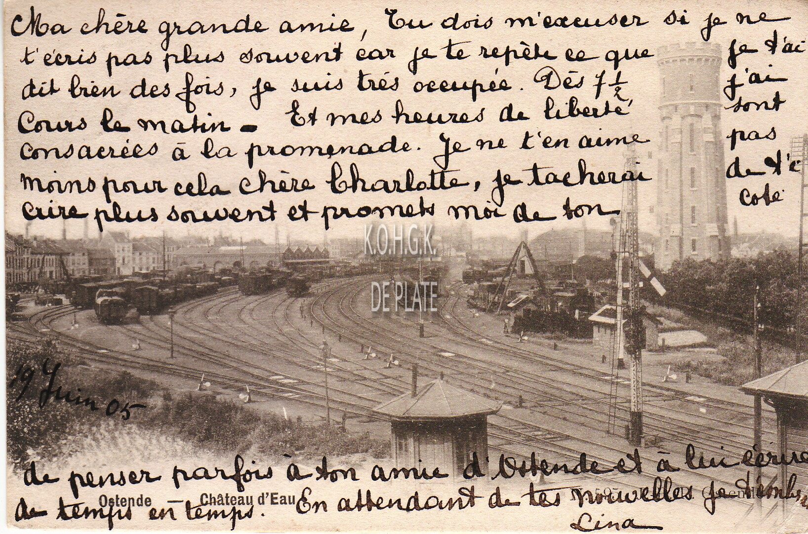 Ostende - Château d'eau. - De treinsporen van en naar het tweede spoorwegstation van Oostende. De bedding wordt nu ingenomen door de Verenigde-Natieslaan. Rechts, de oude watertoren langs de Gistelsesteenweg, nu de Mercatorlaan. Links, het goederenstation langs de Spoorwegstraat