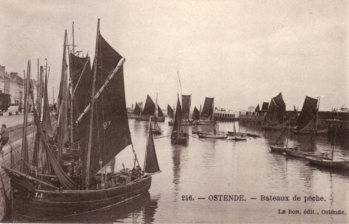 Le Bon, éditeur, Ostende, nr. 216. - Ostende. Bateaux de pêche. - In het midden, open garnaalboten of Oostendse schovers. Links, de Visserskaai. Aangemeerd, een panneschuit, de P.14 "Marie Thérèse".
