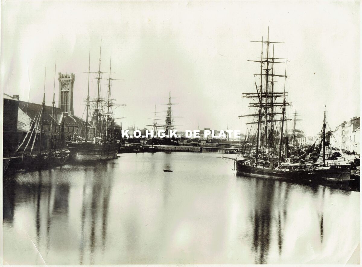 Formaat : 28 x 38 cm. - Zicht op het Eerste Handelsdok met aangemeerde vissersvaartuigen. Links het tweede stadsstation en in de achtergrond de scheepswerven.