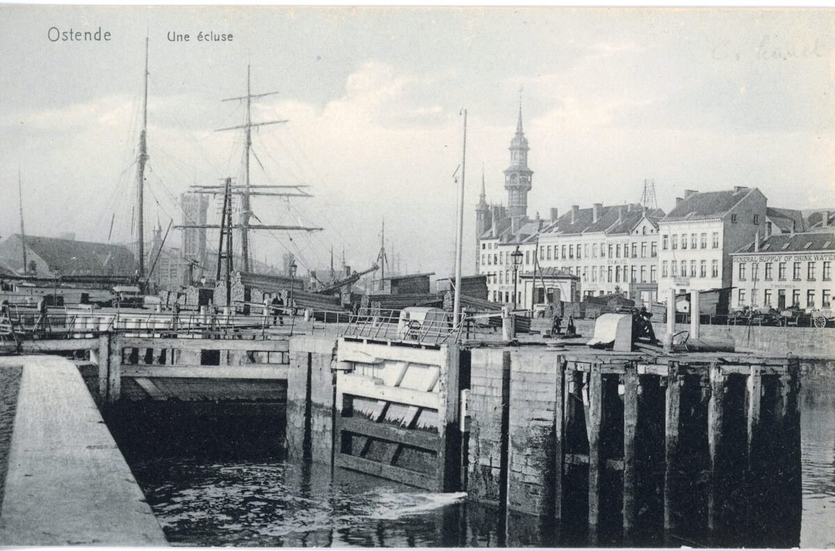 De sluis, gebouwd in 1821, die toegang gaf tot het eerste handelsdok. De sluis was 58,50 m. lang en 12 m. breed. Op de achtergrond, de Keizerskaai, met rechts het Waterhuis met opschrift General Supply of Drink Water en op de achtergrond de toren van het zeevaartcommissariaat of Pilotage.
