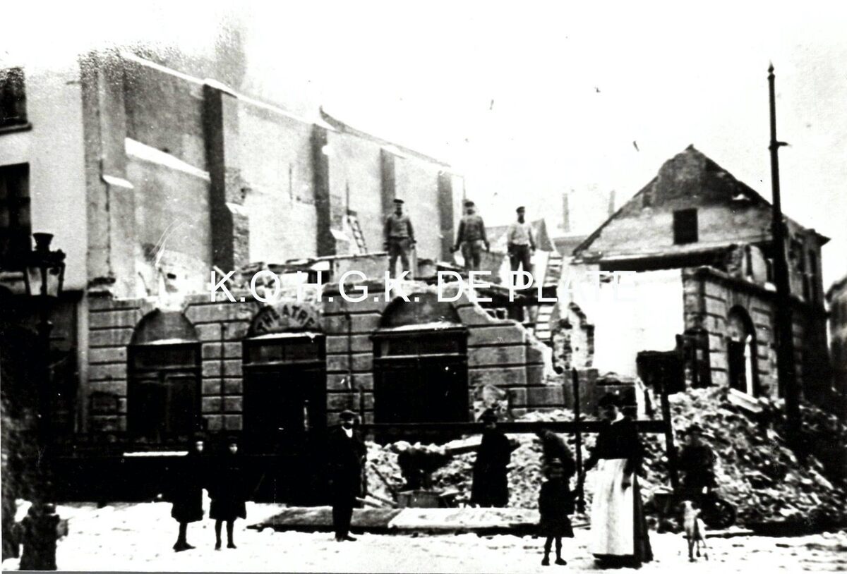 Afdruk. - Formaat : 10 x 14 cm. "De gemeenteraad van 4 december 1906 beslistte de afbraak van de schouwburg. Dit werk werd toegewezen aan de heer Lust voor de som van 860 fr. Enkele dagen nadien gestart, werd de afbraak in april 1907 beëindigd" Het Marie-Joséplein / Jean Marie Bekaert. In : de Plate 1993, p.212