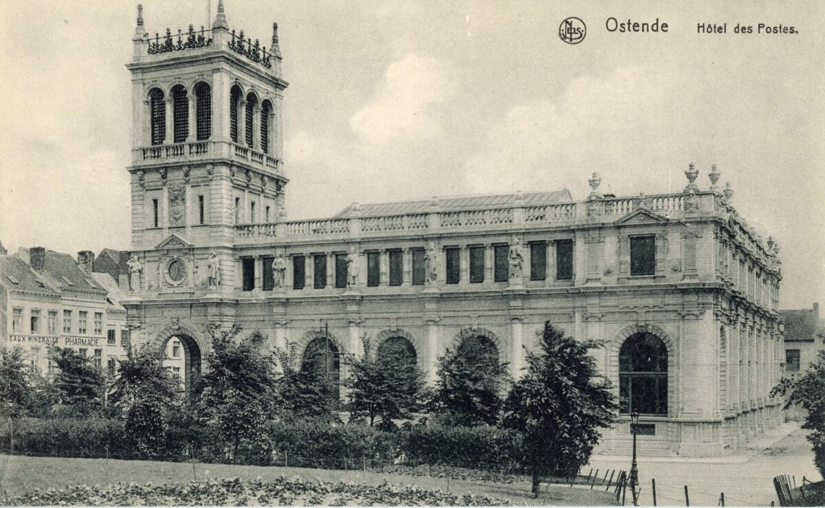 De voorgevel van het postgebouw. Dit gebouw werd tijdens de Tweede Wereldoorlog vernield.
