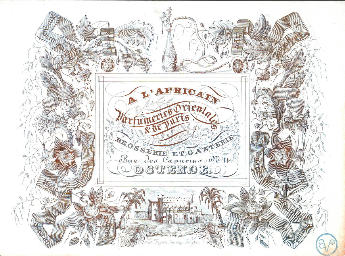 Formaat : 11,3 x 15,3 cm. - A L'Africain Parfumeries Orientales & de Paris, Brosserie et Ganterie. - Rue des Capucins n° 11, Ostende