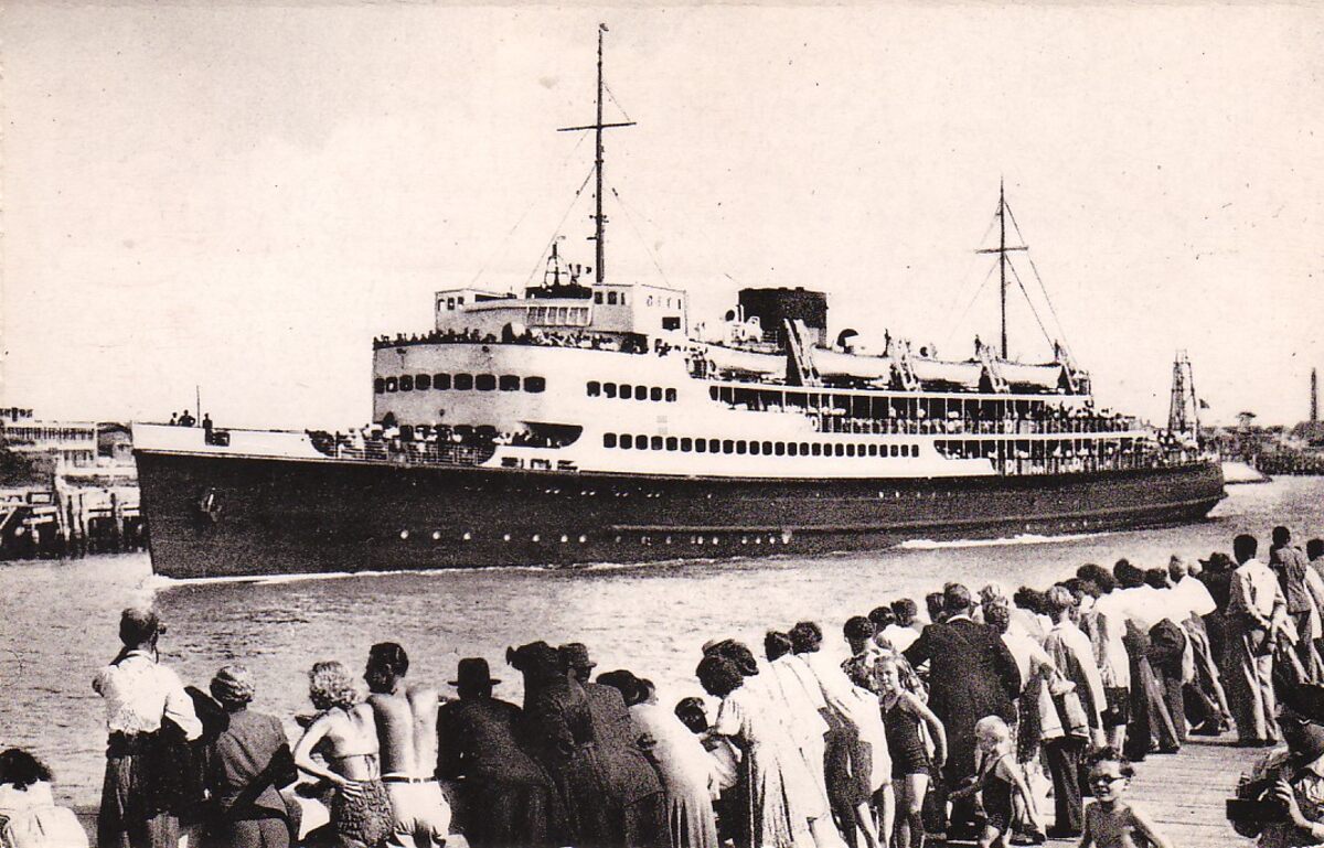 Nels, N° 31. - Ostende - La malle "Prince Baudouin". - Veel volk op het Weststaketsel. De "Prince Baudouin" werd gebouwd op de Cockerill scheepswerf (Hoboken) en in dienst gesteld op 12 augustus 1934. Het schip vertegenwoordigde een ware revolutie voor het Zeewezen. Het was volledig uitgerust met dieselmotoren, zowel voor de voortstuwing als voor de elektrogene groepen. Zelfs de verwarming was elektrisch. Het schip was het eerste motorschip ingezet op de kanaaldiensten en bereikte een snelheid van 25,25 knopen (46,75 km).