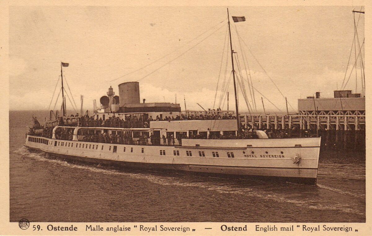 Albert, N° 59. - Ostende - Malle anglaise "Royal Sovereign". Ostend - English mail "Royal Sovereign". Reder G.S.N.C. Lengte 277 ft . Tonnenmaat Brt 1527. Capaciteit 1600 passagiers. Liep op een mijn in 1940 en zonk nabij Bary. Ze kwam met dagtoeristen vanuit Engeland naar Oostende. Het schip verlaat de haven van Oostende. Op de achtergrond detail van de tijseinpost op het ooststaketsel