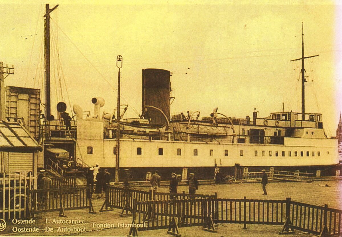 Afdruk, postkaart Nels, formaat : 13 x 9 cm. - Daar er op de pakketbotenkaai geen speciale installaties waren voor het laden en lossen van de auto's op de "London-Stanbul" en er ook geen ruimte was om iets in te richten, legde het schip aan op post II van de Oosteroever, achter de werkhuizen van het Zeewezen. De neerklapbare bruggen (links) die op verschillende dekhoogten waren geplaatst, pasten in speciaal daartoe in de kaaimuur gehakte sponningen. De bruggen waren op verschillende dekhoogten geplaatst om het laden en lossen toe te laten bij de verschillende tijhoogten.