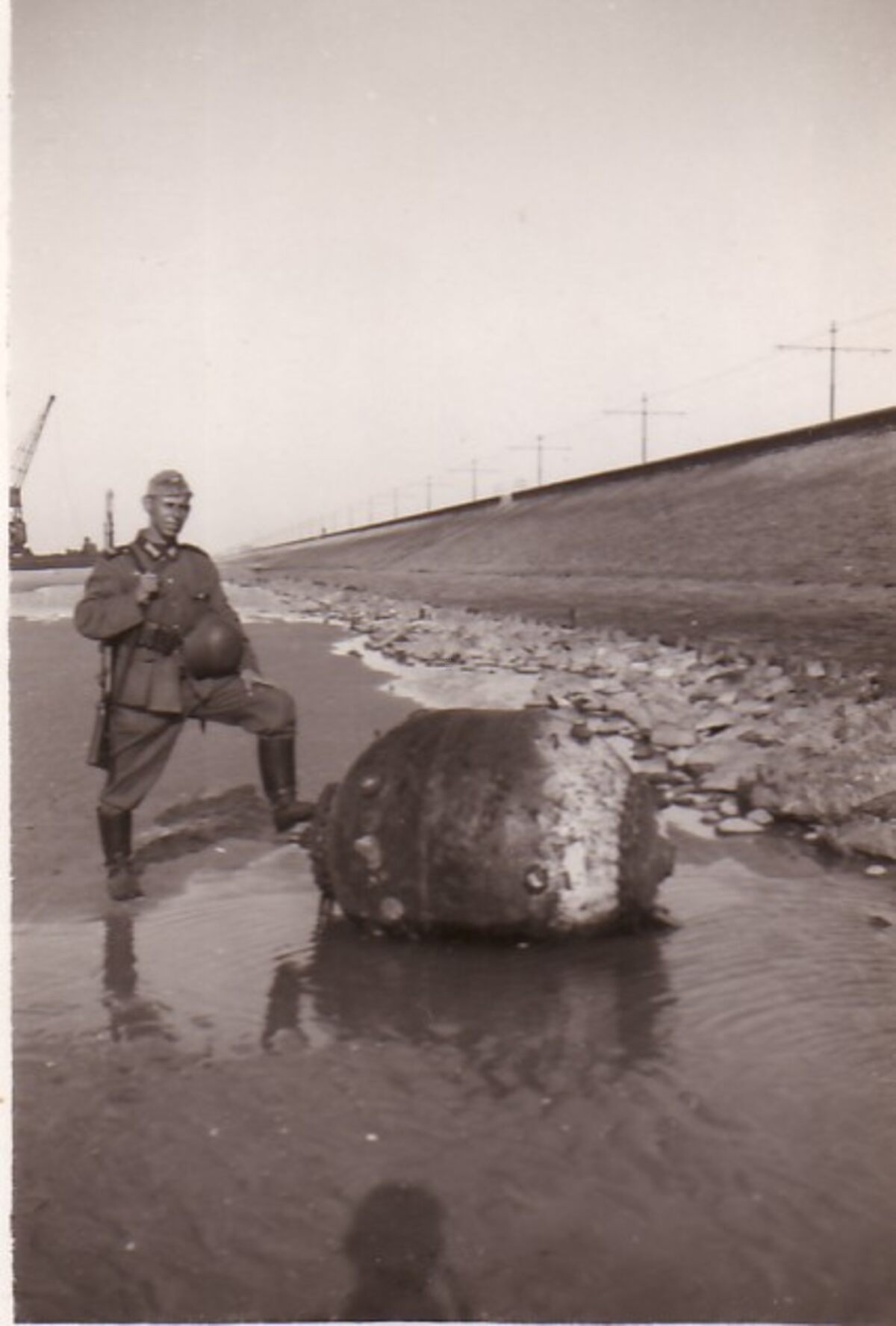 Mijn aangespoeld op strand tussen Raversijde en Middelkerke augustus 1940
