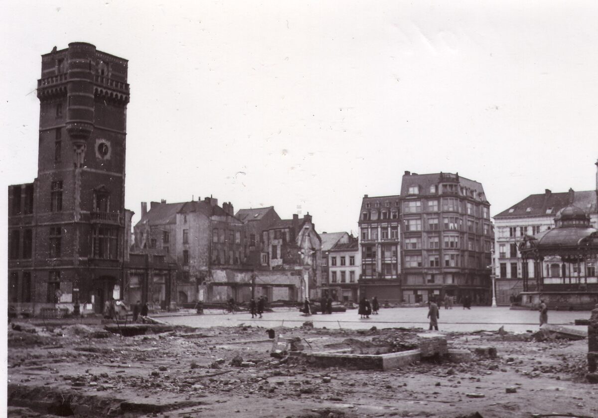 Foto : 9 x 6 cm. - Links de toren van het verwoeste stadhuis, waarvan de gevel reeds werd afgebroken. Op de achtergrond een gedeelte van de Kapellestraat
