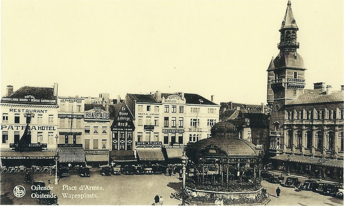 Foto : 9,5 x 6.5 cm. - Het Wapenplein na de bombardementen van mei 1940. Gedeelte tussen de Brabant- en Breydelstraat. Rechts de Kerkstraat. Foto : (kopie van postkaart). Het Wapenplein in het Interbellum. (met dank aan Redgy Hermant)