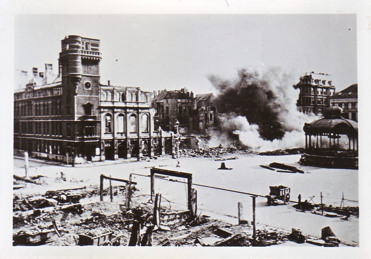 Foto : 9.5 x 6.5 cm. - Het Wapenplein na de verwoestende bombardementen van mei 1940. De puinen van het Stadhuis worden gesloopt.