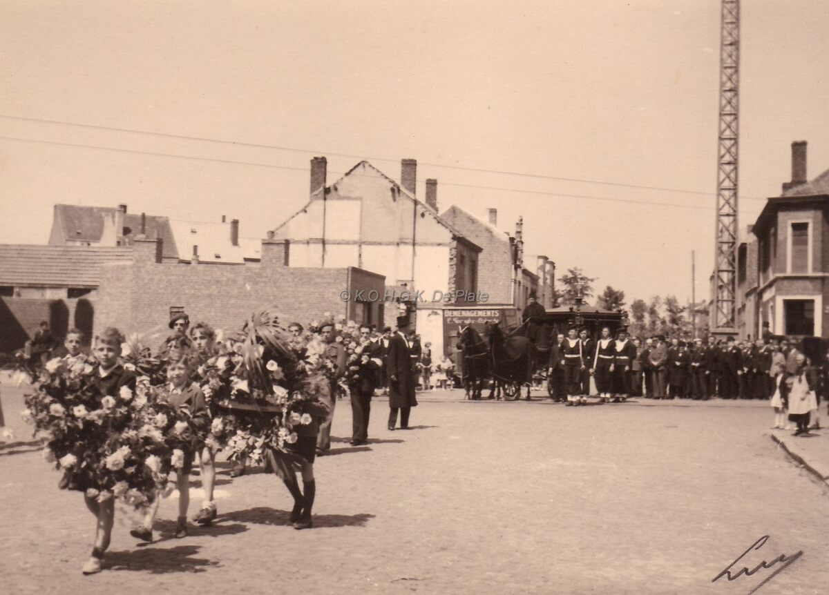 Een begrafenisstoet,waarschijnlijk van een hoog marineman, in de Stuiverstraat en de Torhoutse steenweg,op de achtergrond het Sinte Catharinaplein. Op de hoek was café "Sportwereld",er naast een telefoonmast.