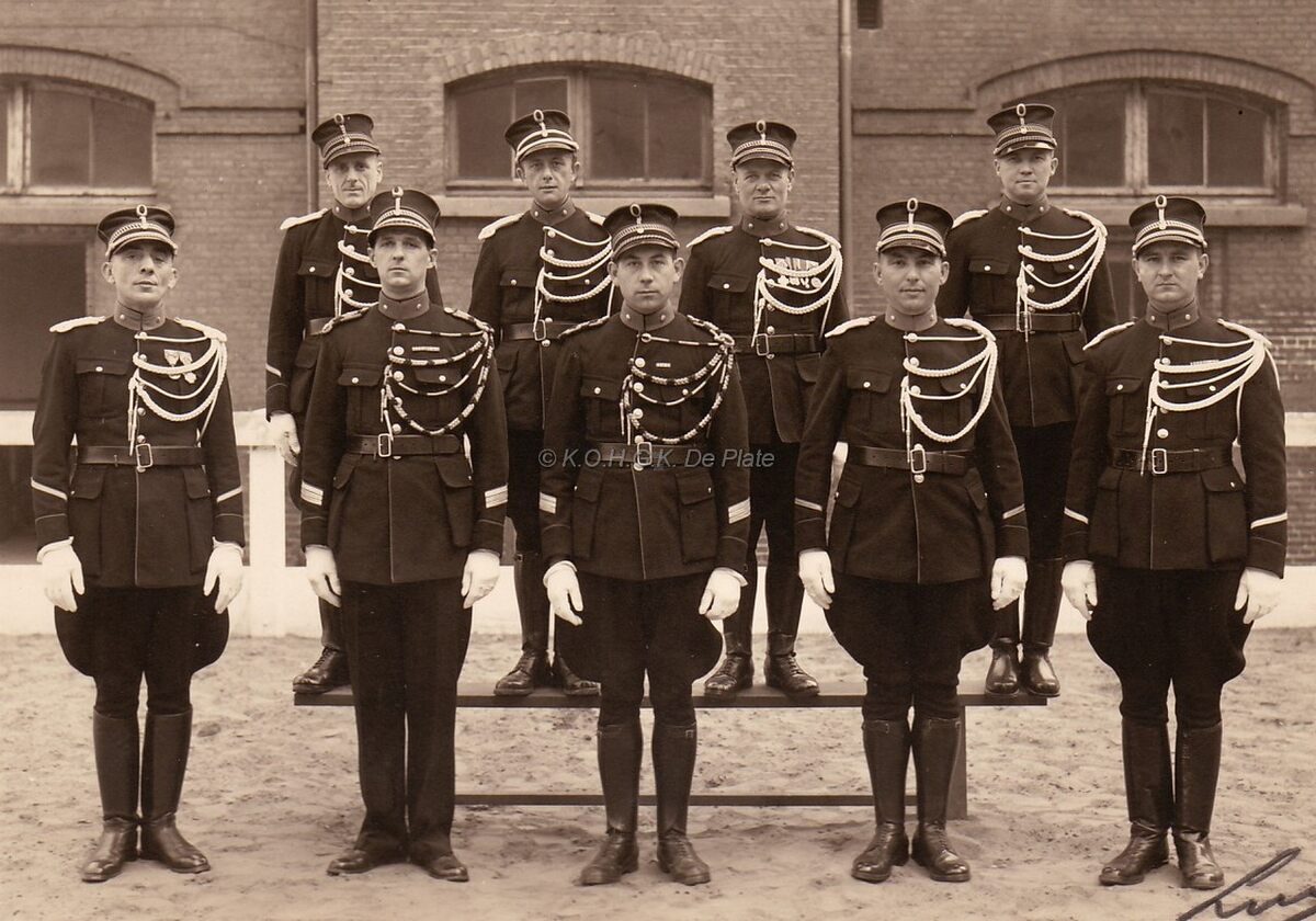Groepsfoto van een sectie rijkswachters (met sjako) op de binnenkoer van de kazerne aan de Alfons Pieterslaan.