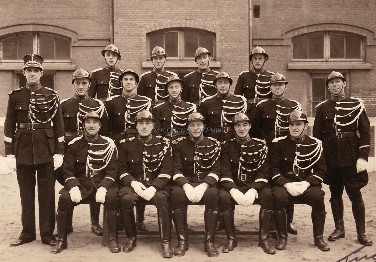 Een groep rijkswachters (met helm) op de binnenkoer van de kazerne aan de Alfons Pieterslaan.