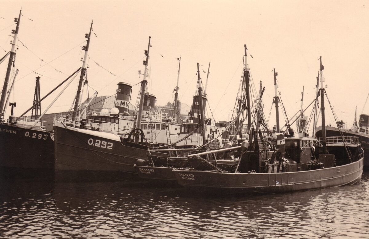 Formaat : 13 x 18 cm. - Vissersvaartuigen van de rederij N.V. Motorvisserij in het Visserijdok aan de Hendrik Baelskaai. Van rechts naar links : O.290 Teniers, O.291 Jordaens, O.292 Van Eyck, O.293 Van der Weyden