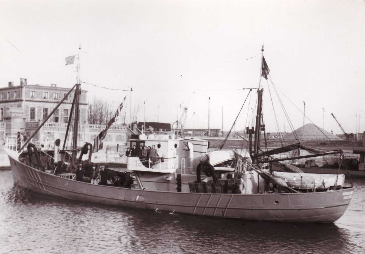 Formaat : 13 x 18 cm. - De O.319 Noordende II in het Vlotdok tijdens een proefvaart. De vrouwen van de bemanning staan op de brug. Links het gebouw van de Havenkapitein.
