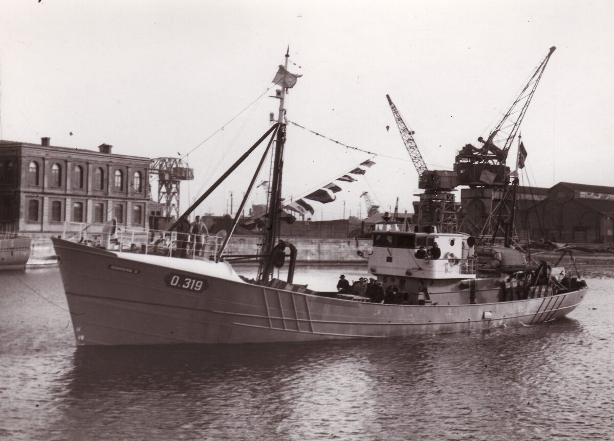 Formaat : 13 x 18 cm. - De O.319 Noordende II in het Vlotdok tijdens een proefvaart. De familie van de bemanning is mee. Het vaartuig werd in 1947 gebouwd op de scheepswerf Beliard-Crighton & C° voor de rederij Noordende.