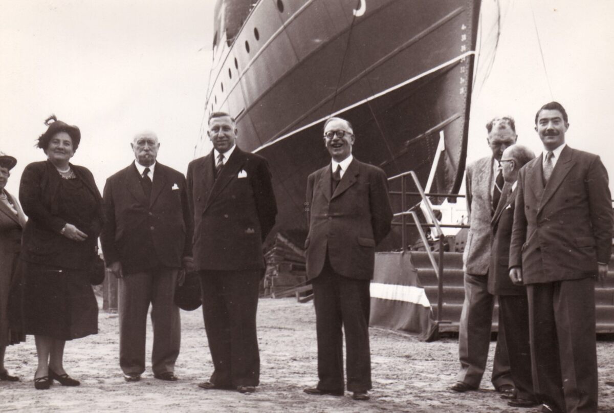 Loodsboot 5 is klaar voor de stapelloop. Centraal minister Paul-Willem Segers, rechts van hem, burgemeester Hendrik Serruys, helemaal rechts, Roger De Kinder, schepen.