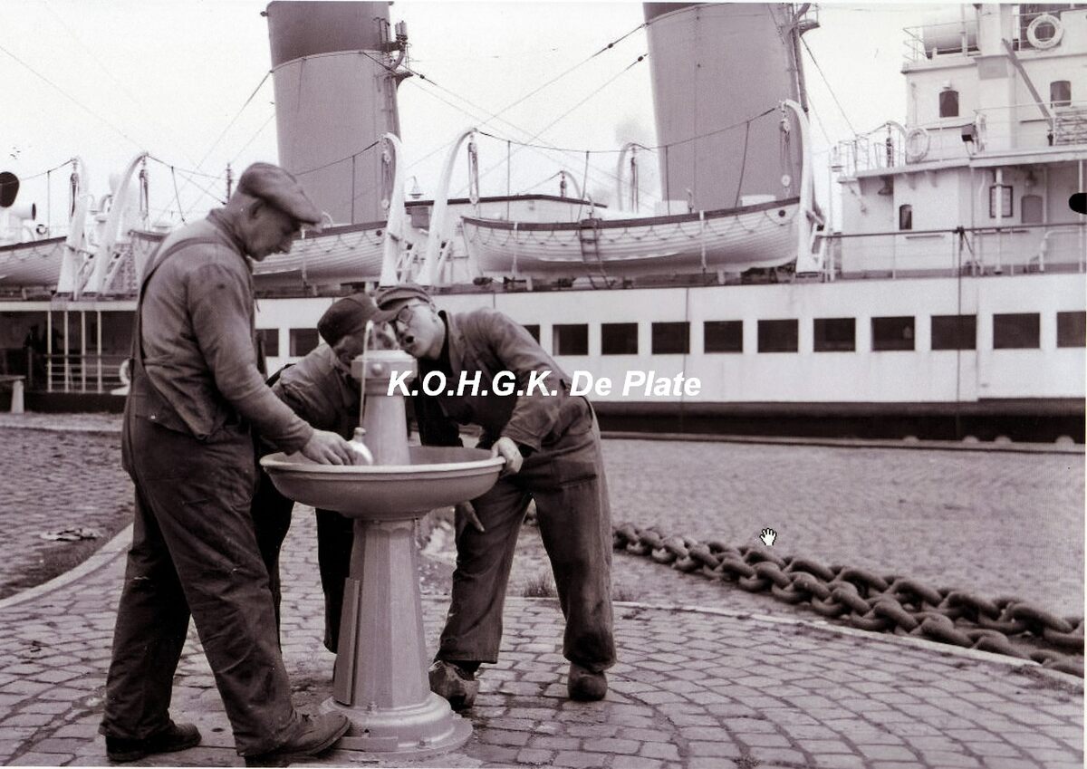 Afdruk, formaat : 29.5 x 21 cm. - 3 werklieden van het Zeewezen aan een drinkfontein. Op de achtergrond de pakketboot "Prince Charles"