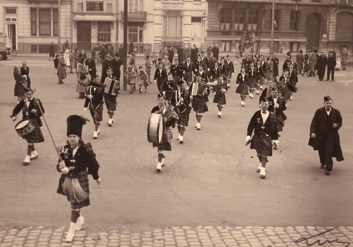 De folkloristische vereniging "De Oostendse Schotten" op het Candadaplein.Op de achtergrond de Hendrik Serruyslaan.