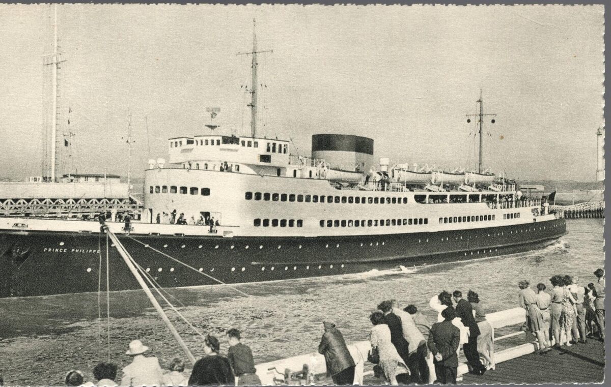 Arfo. - De pakketboot "Prince Philippe" vaart de haven van Oostende binnen. Vooraan, het Westaketsel en achteraan, de tijseinpost op het Ooststaketsel.