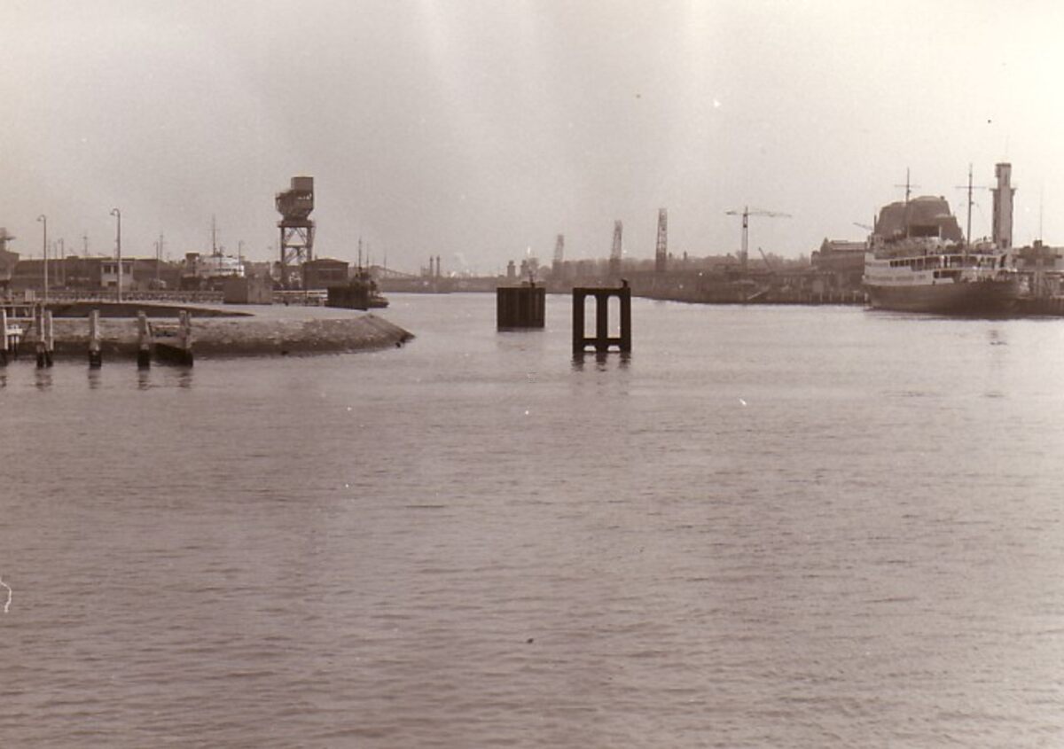 Formaat : 13 x 18 cm. Zicht op havengeul met de pakketboot "Prince Philippe" die aangemeerd ligt aan het "Controlegebouw der Car-ferry. Let op de "tijtoren", waarop een synoptische schaal aangebracht wordt met automatische aanduiding van de waterstand via speciale verlichting. Bovenaan de toren, een vlaggenmast en een grote driezijdige klok. Let op de twee dukdalven