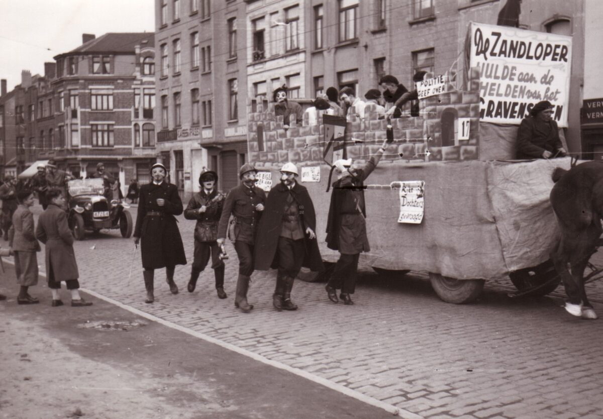 "Praal" wagen van de Oostendse universitairen "De Zandloper" in de carnavalstoet op de Torhoutsesteenweg, nabij het Prof. Mac Leodplein. De bezetting van het Gravensteen van Gent op 16 november 1949 door de studenten wordt herdacht.